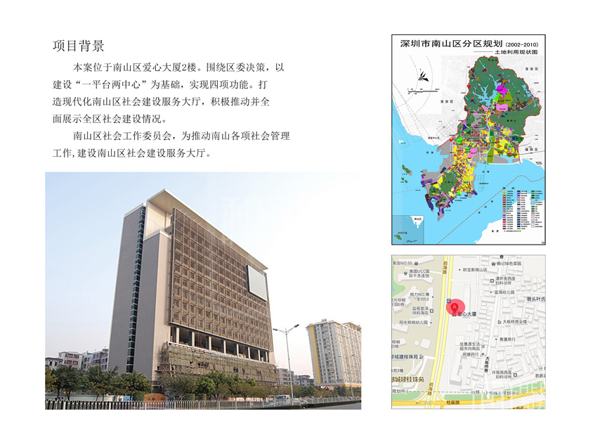 | 設(shè)計(jì)說(shuō)明 | 本案位于南山區(qū)愛心大廈2樓。圍繞區(qū)委決策,以建設(shè)“一平臺(tái)兩中心”為基礎(chǔ),實(shí)現(xiàn)四項(xiàng)功能。打造現(xiàn)代化南山區(qū)社會(huì)建設(shè)服務(wù)大廳,積極推動(dòng)并全面展示全區(qū)社會(huì)建設(shè)情況。 | ||||