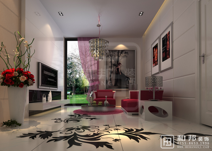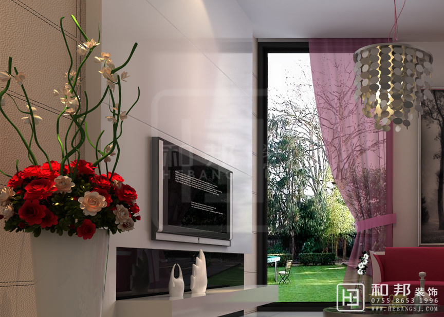 設計說明紅色系的沙發、電視柜旁邊搭配一株紅粉搭配的植物,給人一種協調的美感,傳遞著舒適的氣息,明亮的光線從寬大的窗戶照進,讓客廳空間顯得寬敞大氣。
